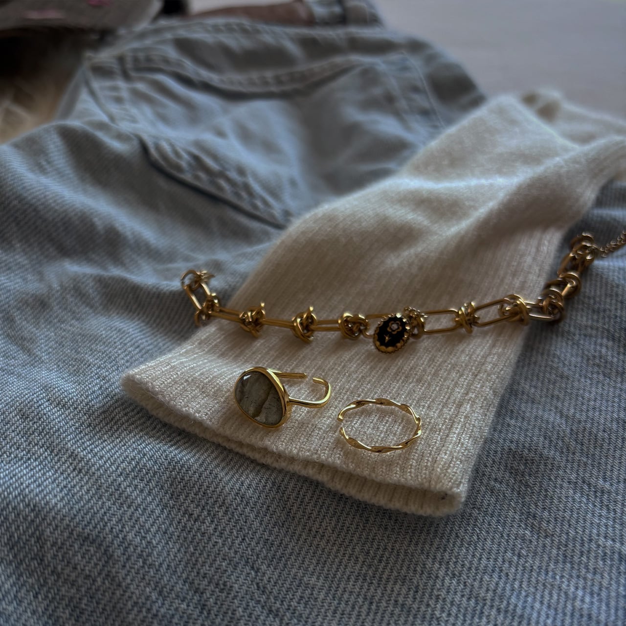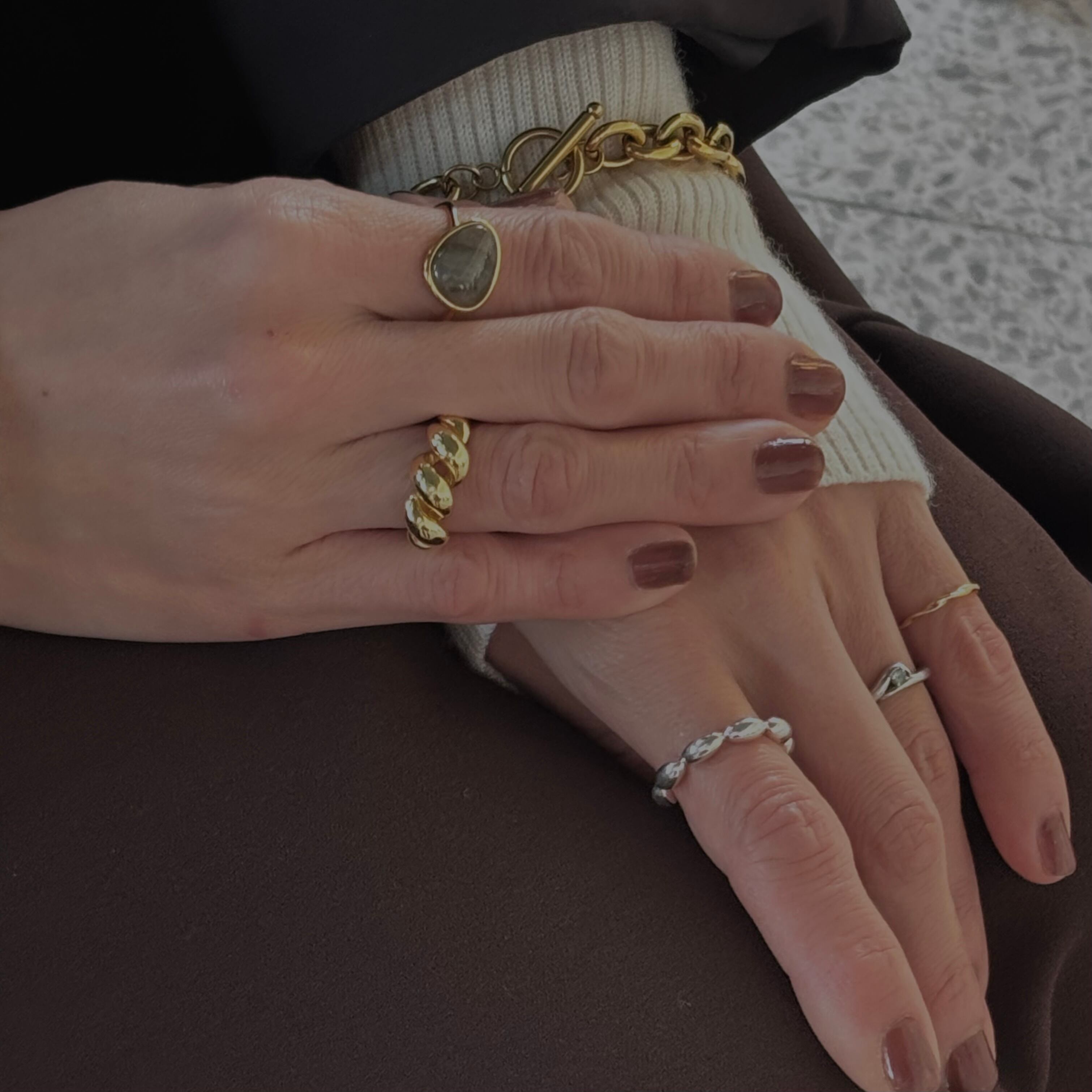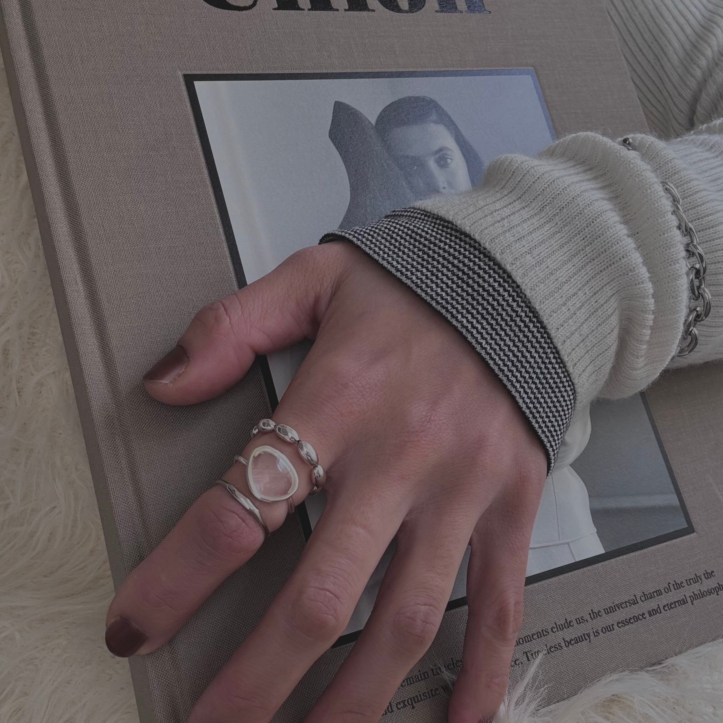 天然石のナチュラルな輝きが手元を印象的に見せてくれるリングです。大きめの石なのに派手にならず洗練された印象に。単体でも存在感がありますが、他のアイテムと組み合わせることによってより美しさが際立つと思います。