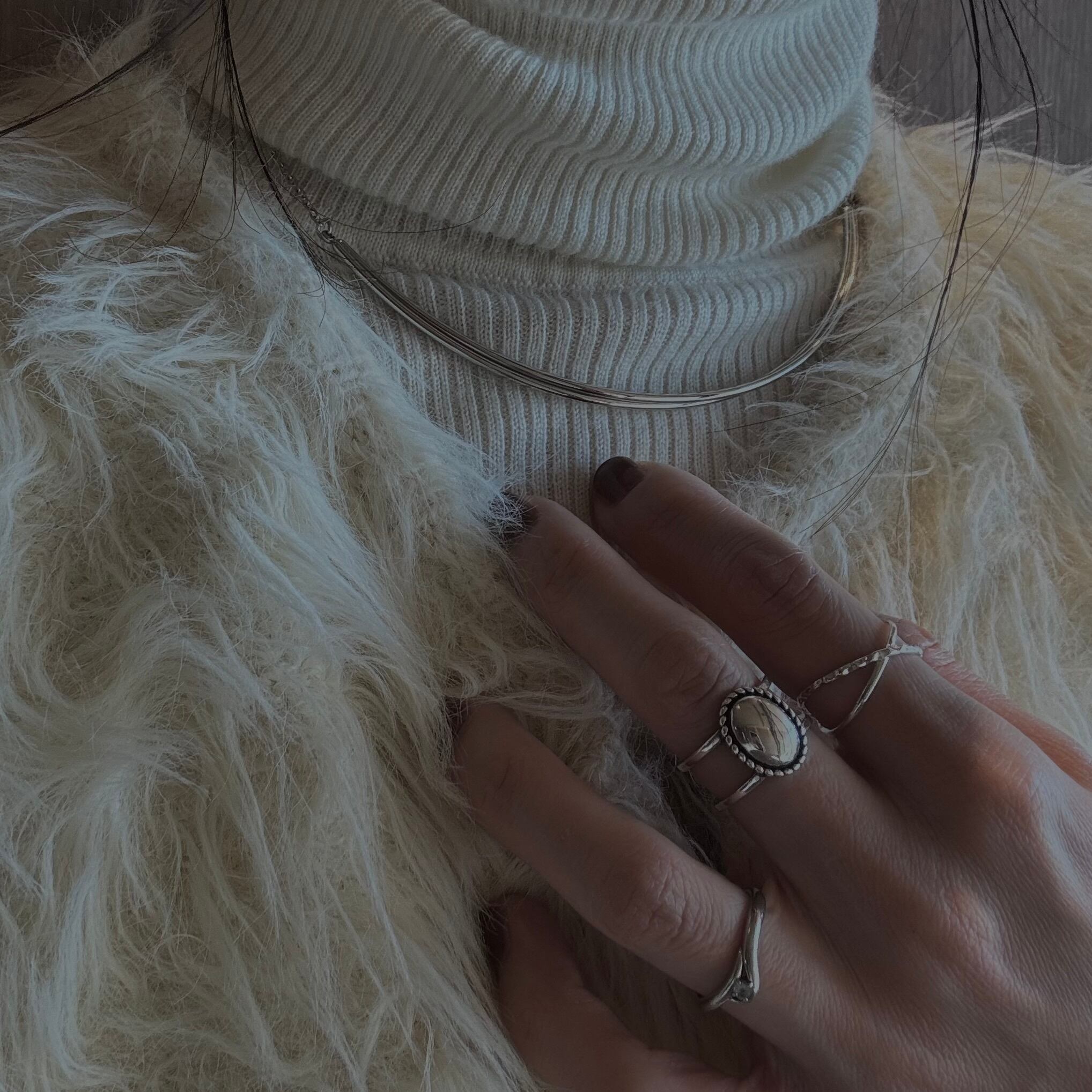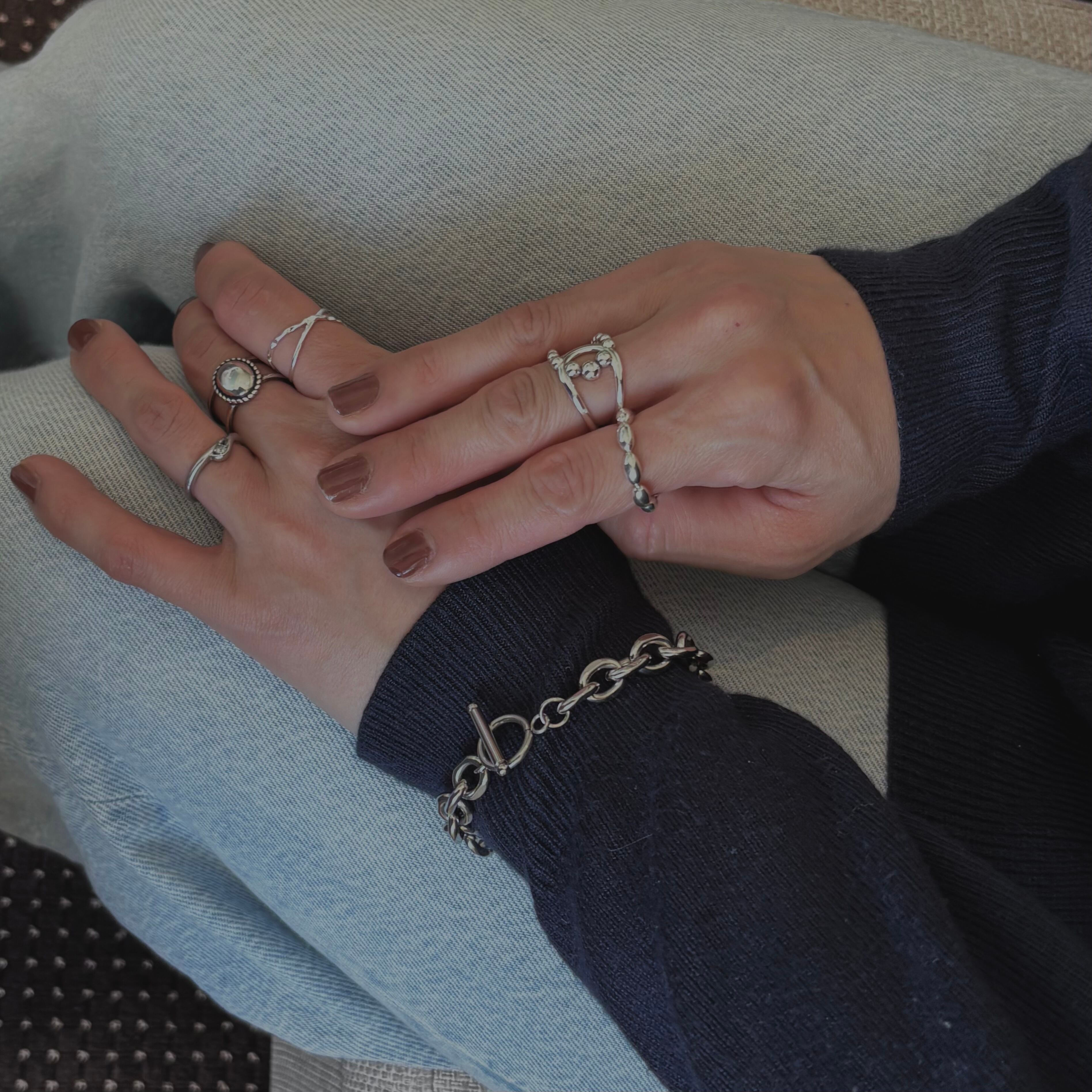 シルエットは大きめですが、リングの線は細身なのでさりげななく手元を引き立ててくれます。