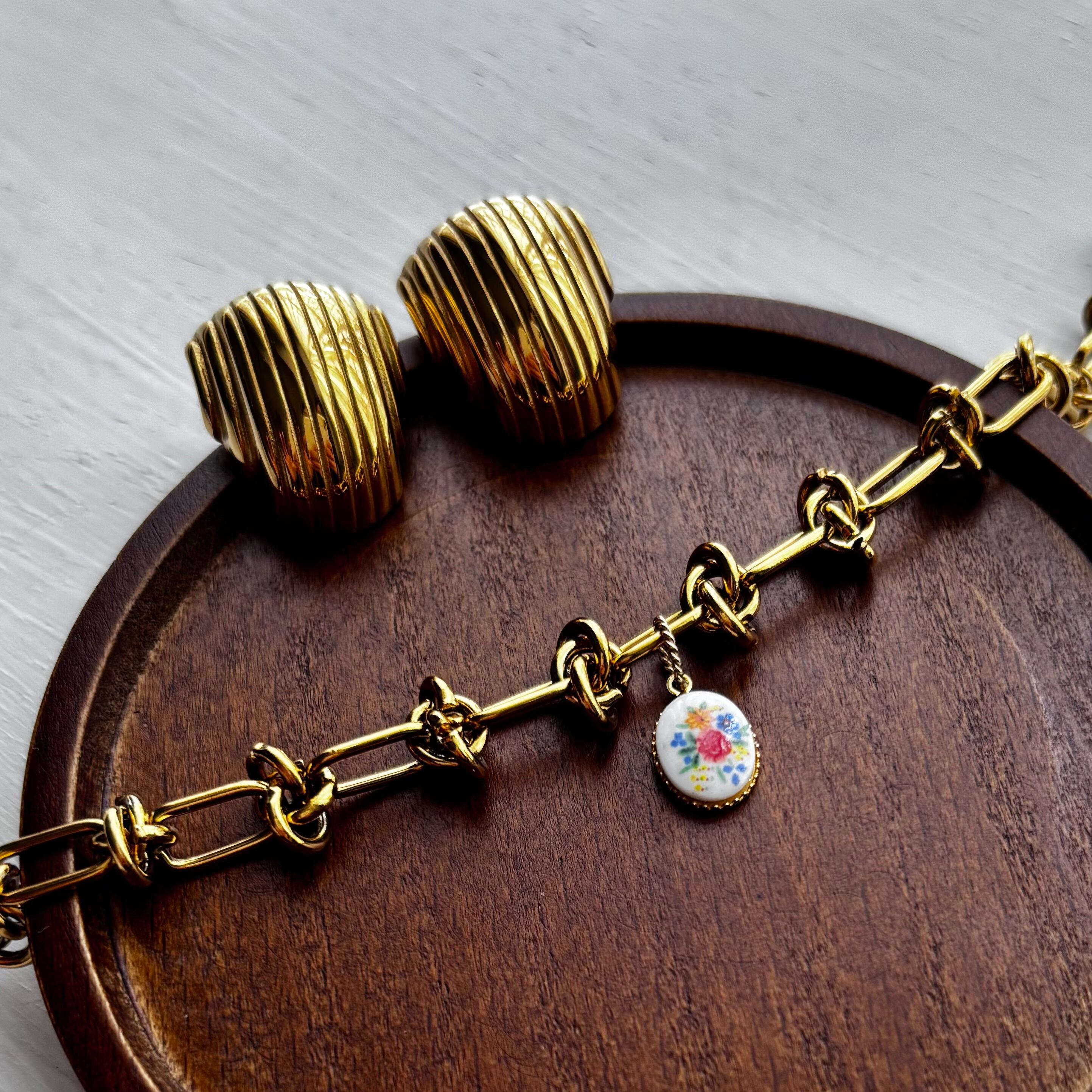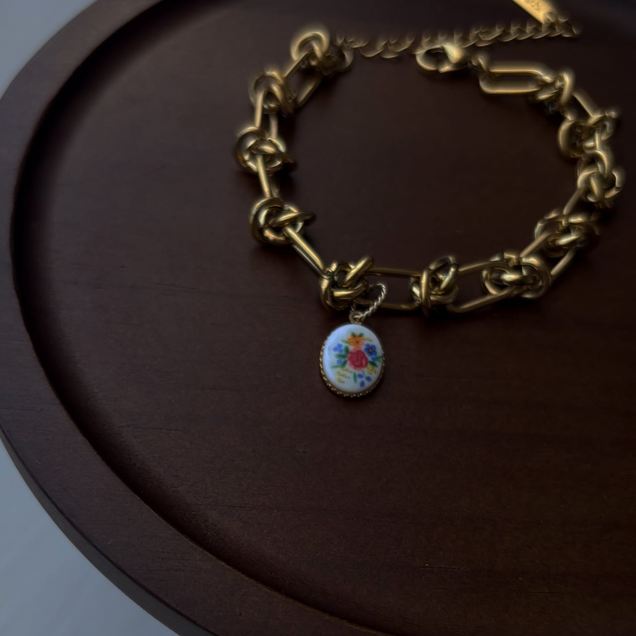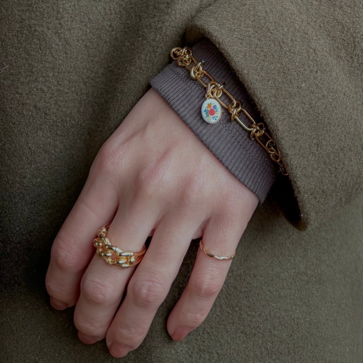 現代的なデザインとヴィンテージの風合いが融合した魅力的なチェーンブレスレット。ヨーロッパから輸入された貴重なパーツを使用し、視界に入るたびに特別感を感じられるアイテムです。