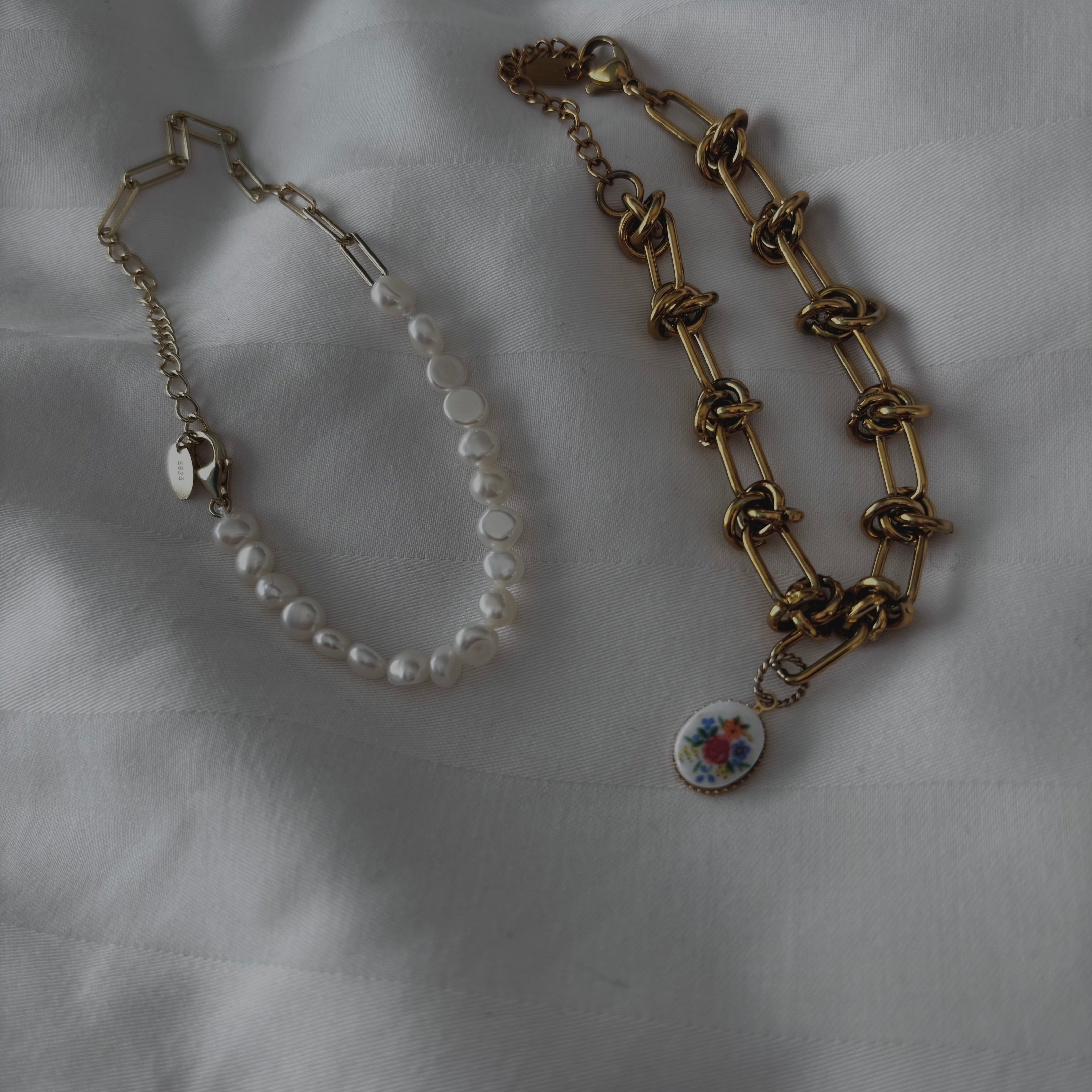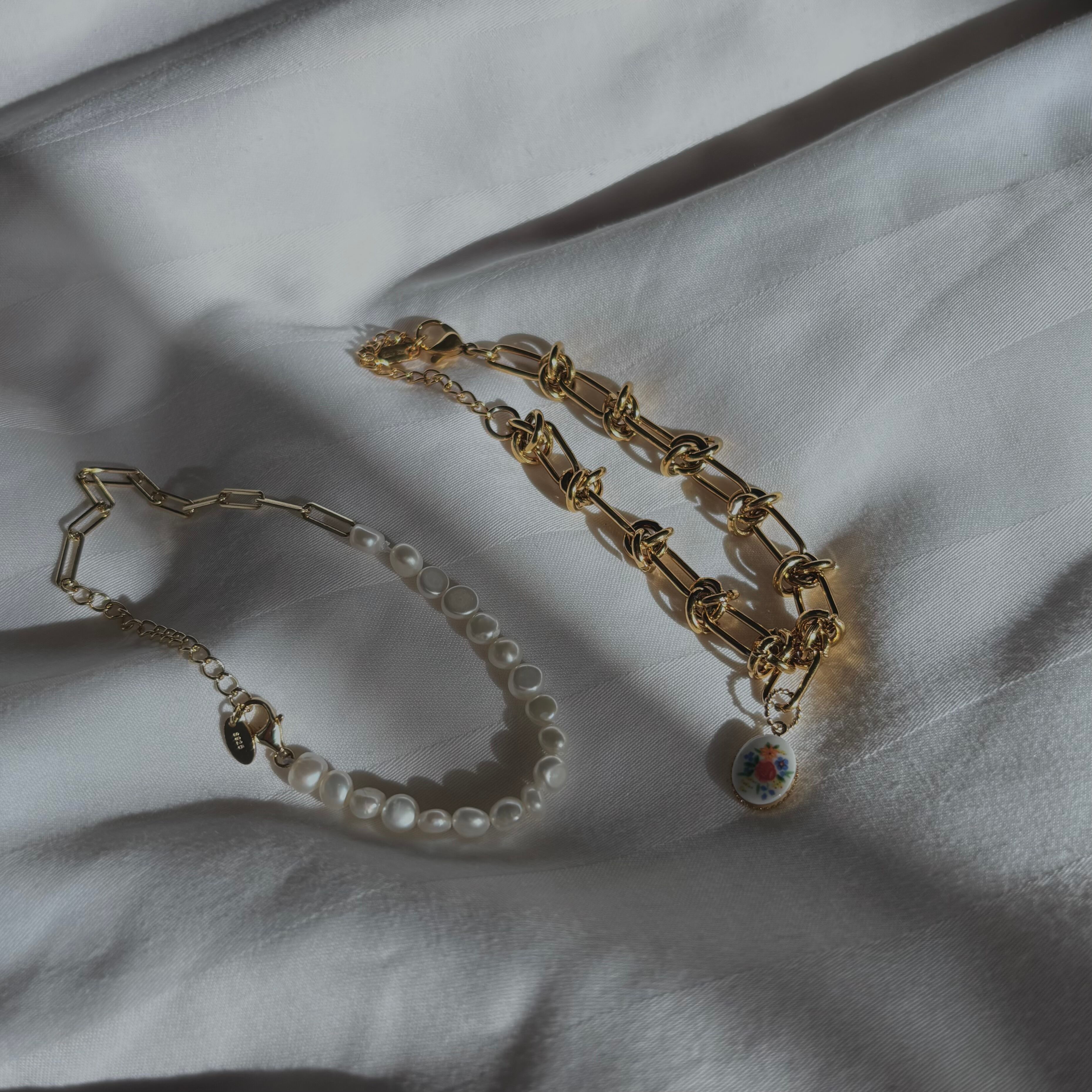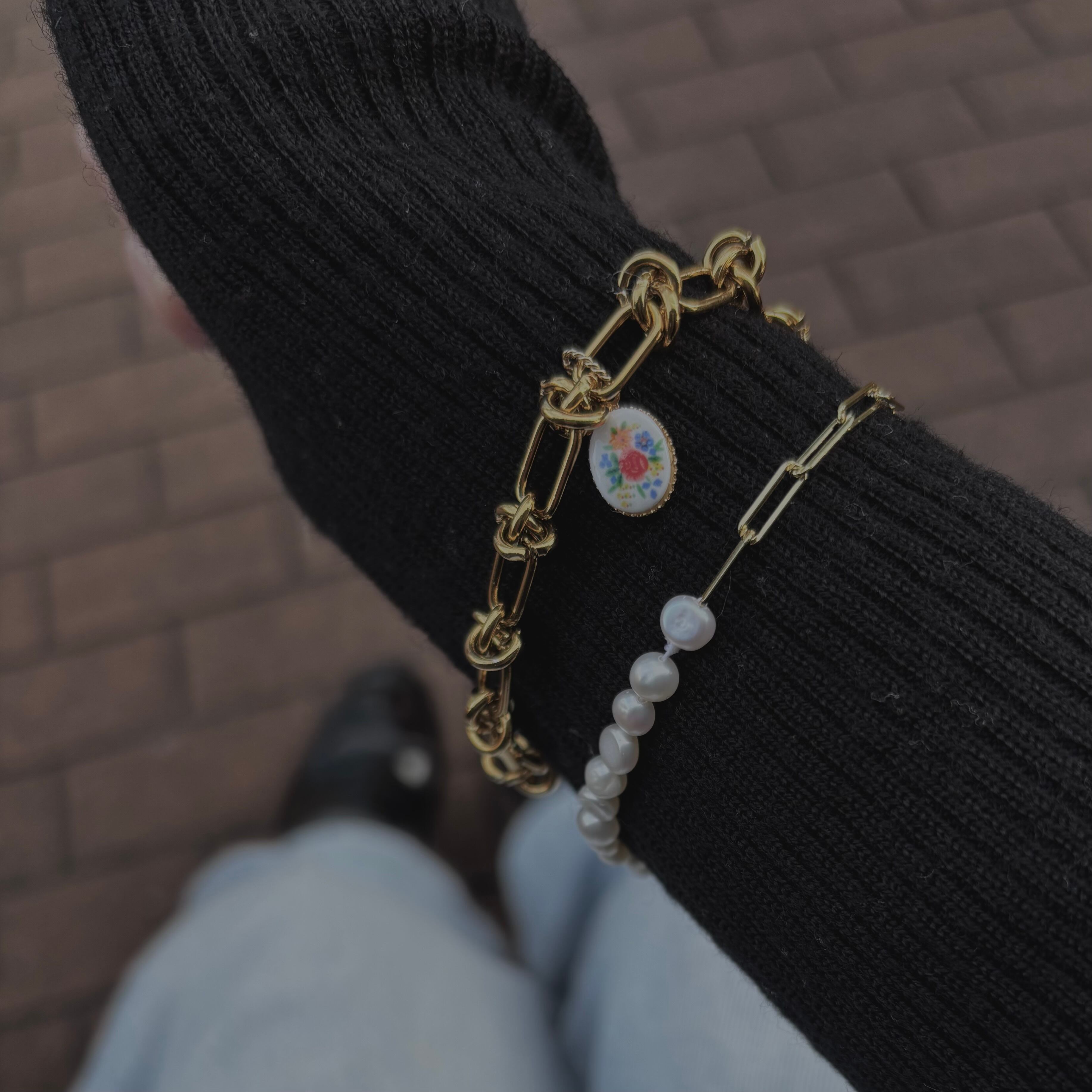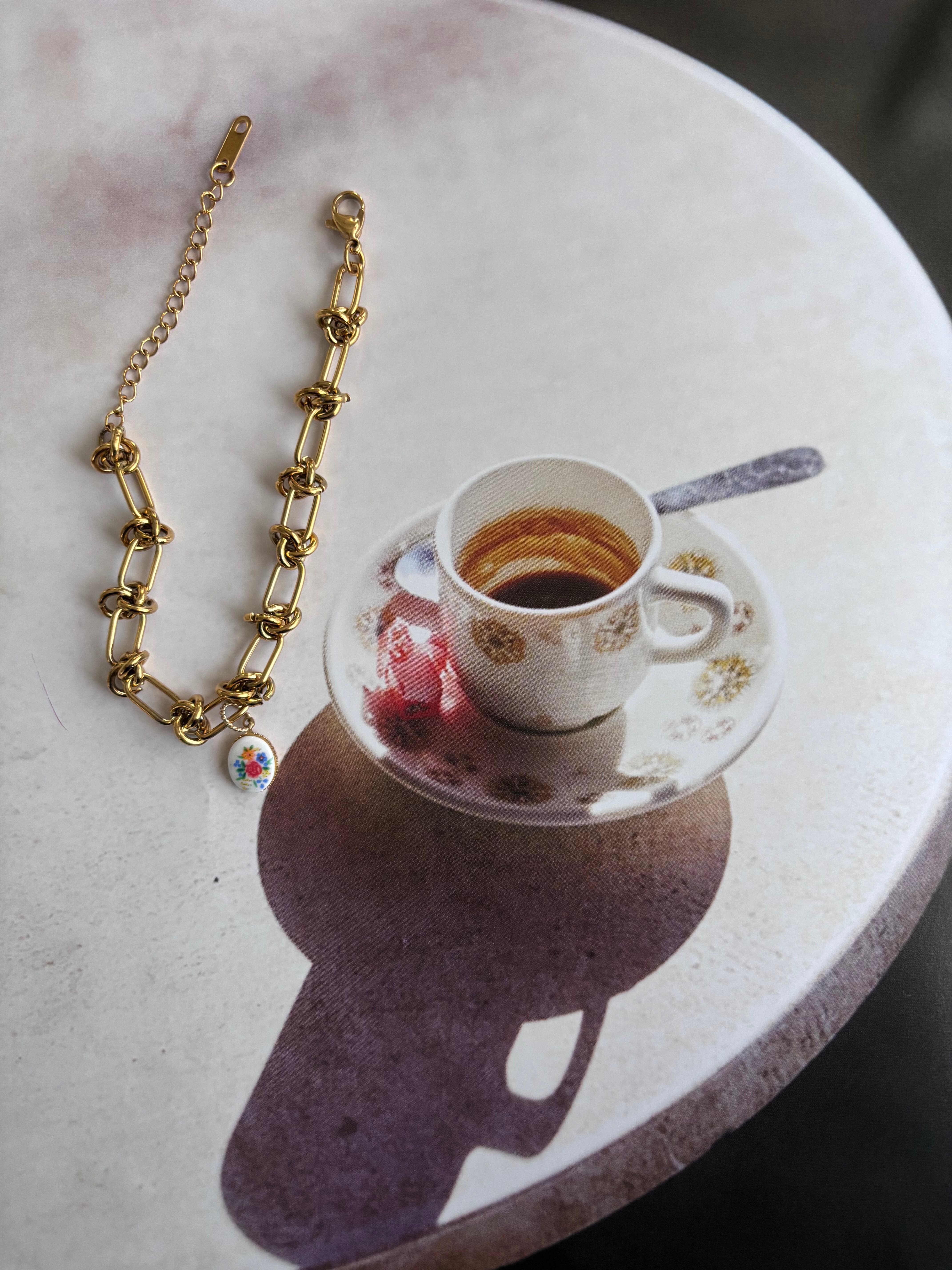 現代的なデザインとヴィンテージの風合いが融合した魅力的なチェーンブレスレット。ヨーロッパから輸入された貴重なパーツを使用し、視界に入るたびに特別感を感じられるアイテムです。
