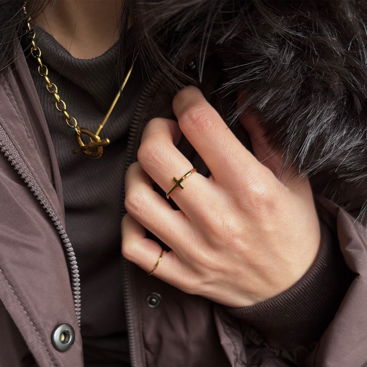 ポイントでもあるマンテルパーツは、コーディネートにプラスするだけでトレンド感がアップし、マンテルの位置を変えてY字シルエットにしたり前後逆にも使用できるので、その日のファッションに合わせて楽しめます。