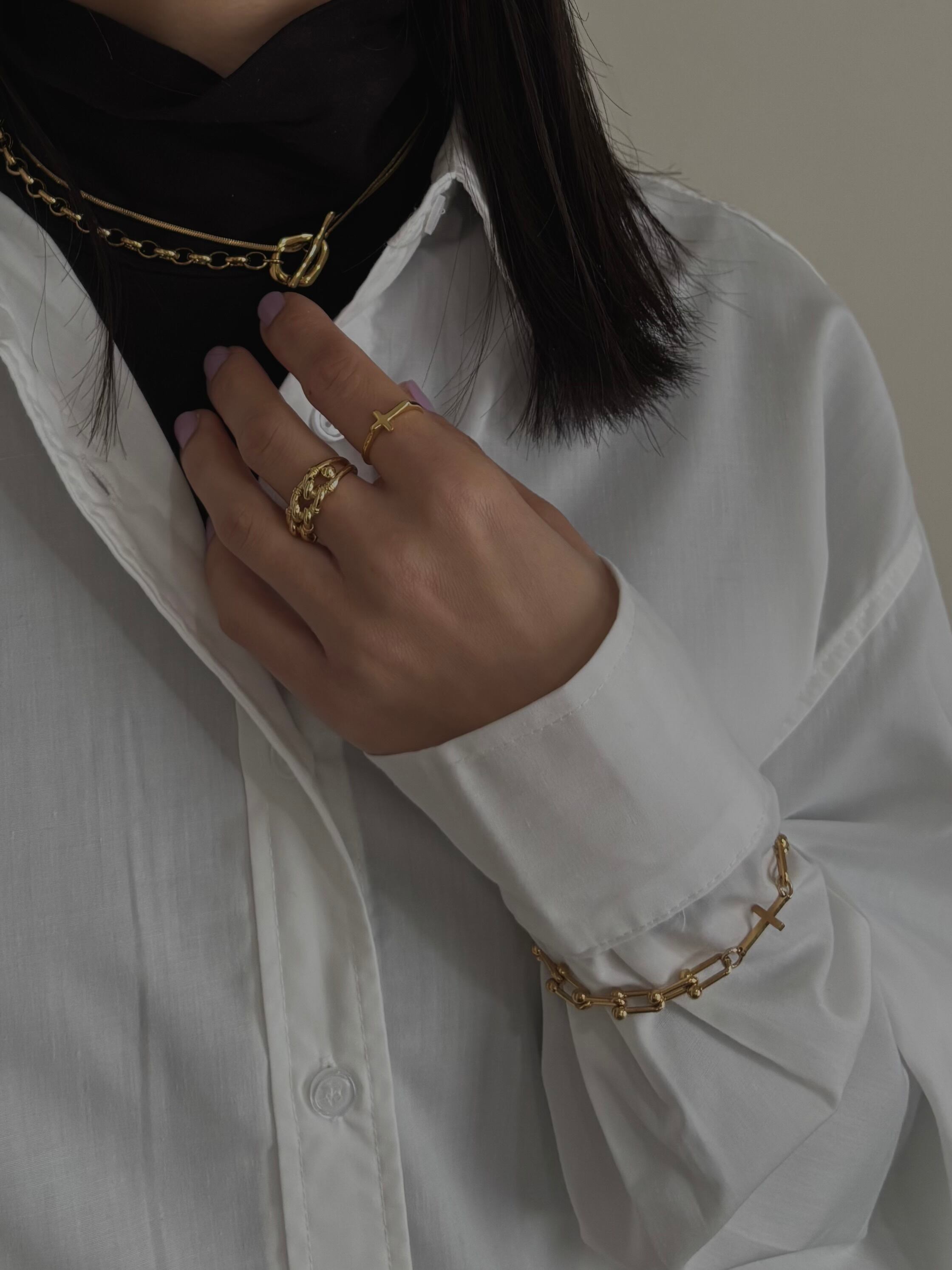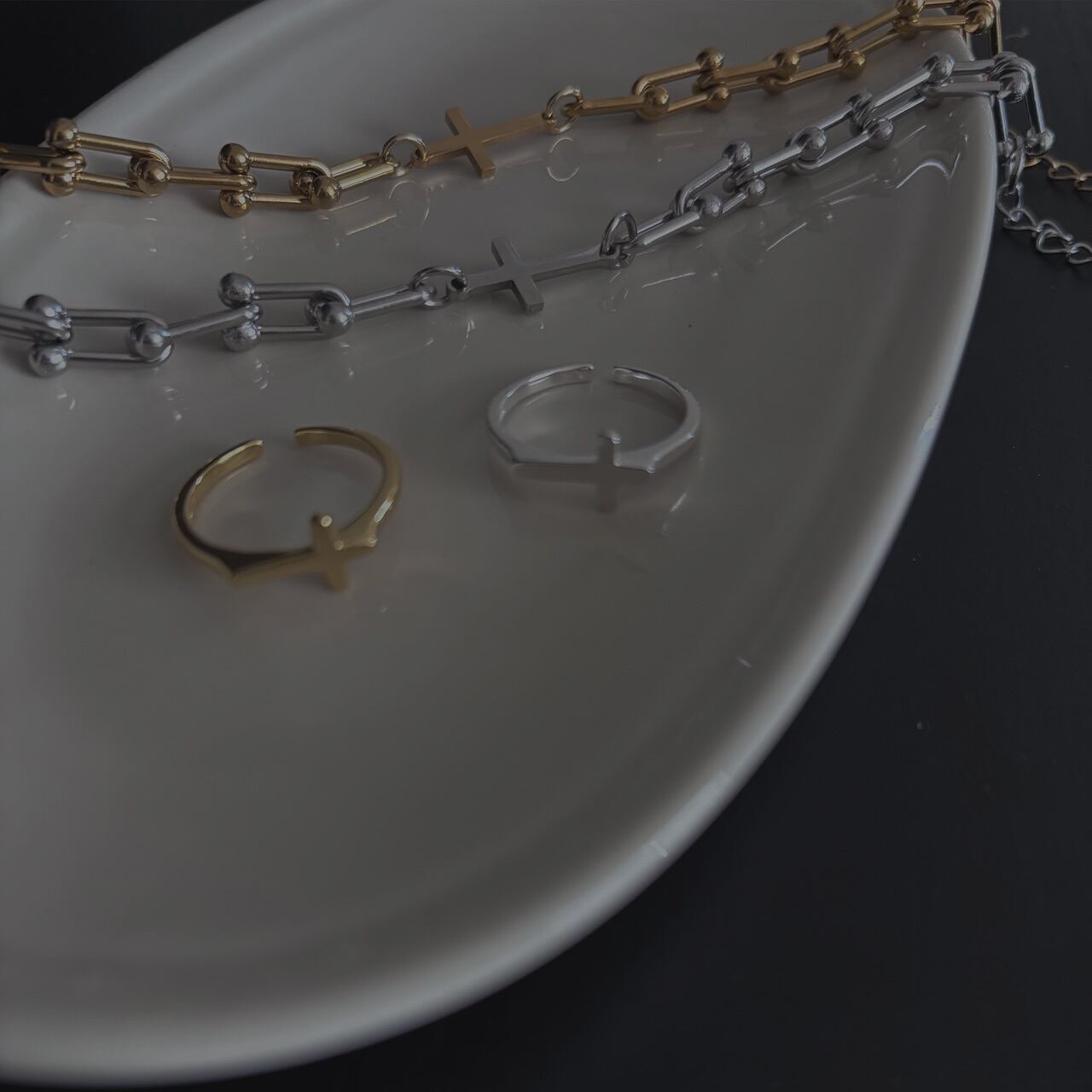 モードなUチェーンにクロスが配置されており上品さにシャープさを加えた大人のこだわりアクセサリー。