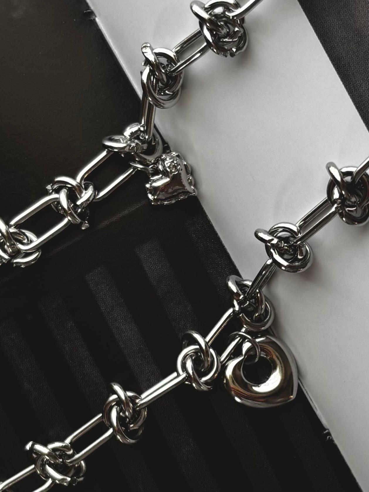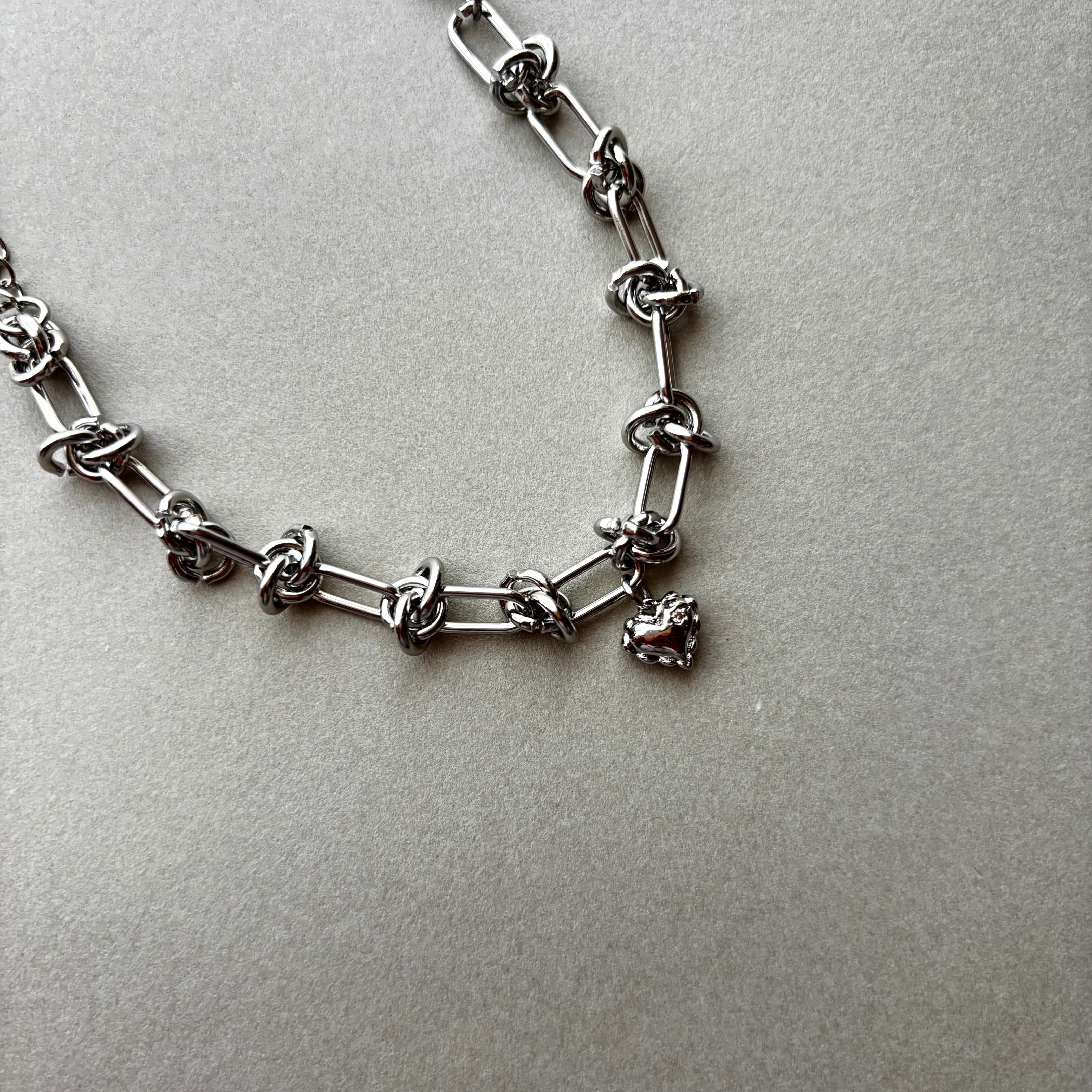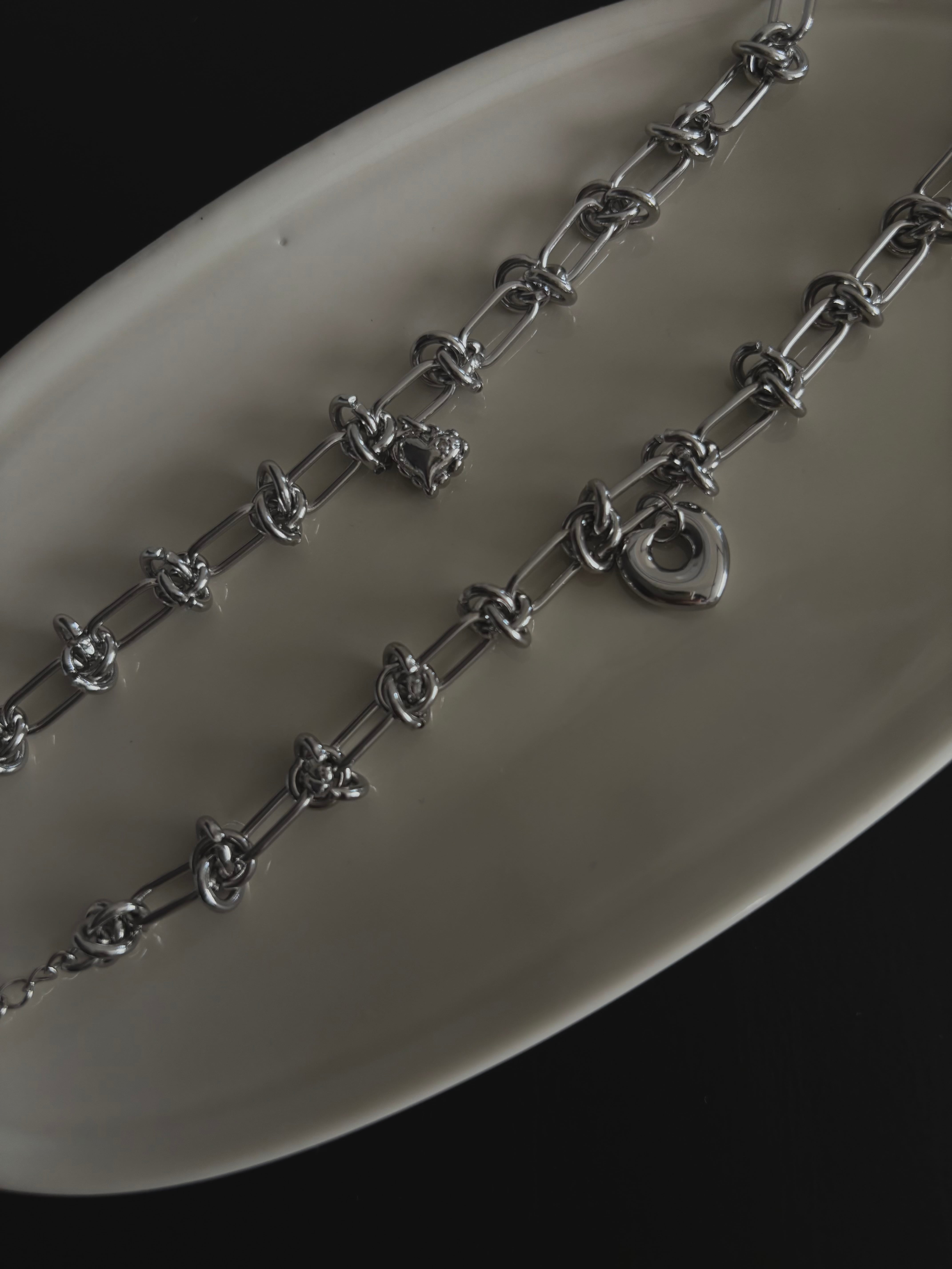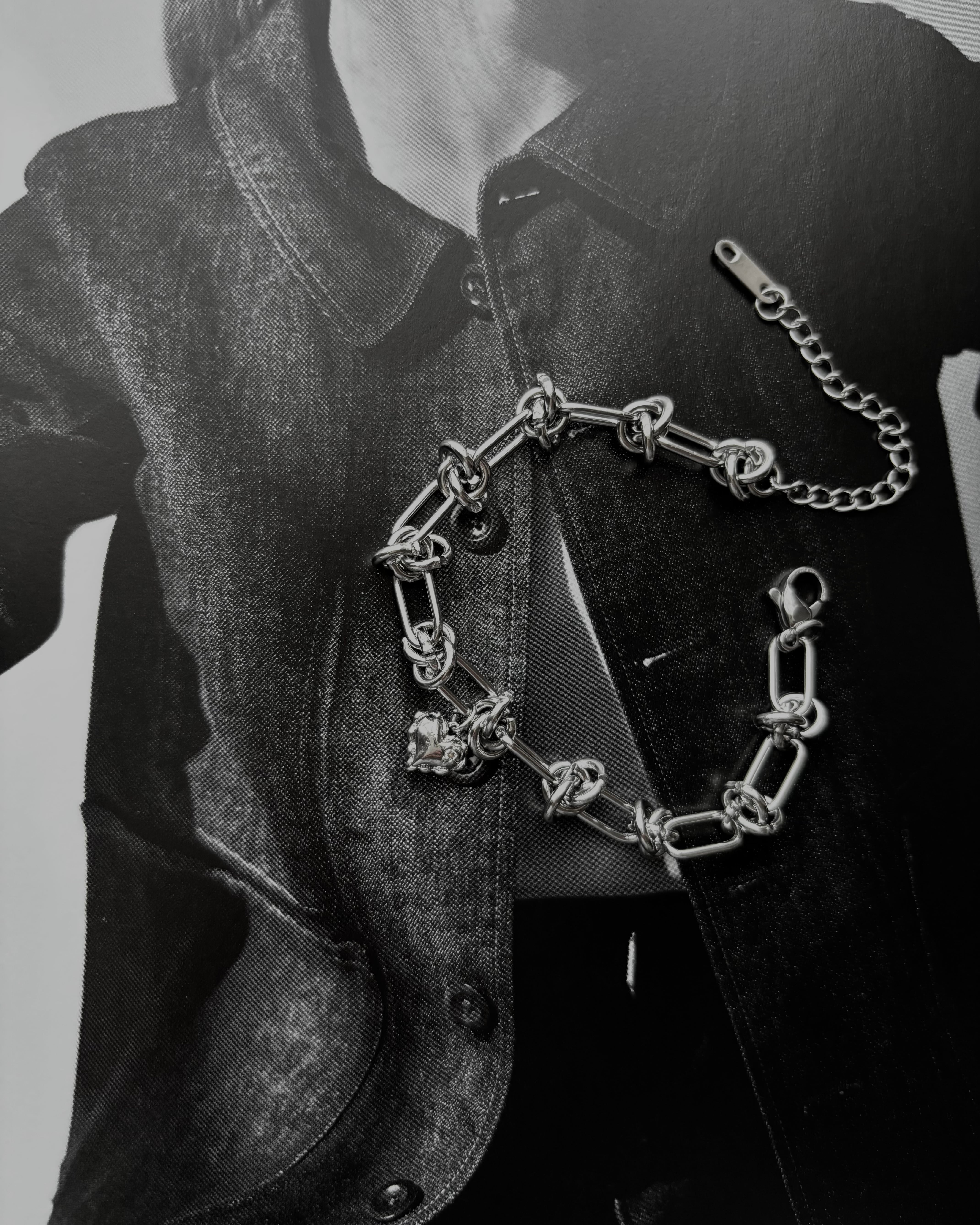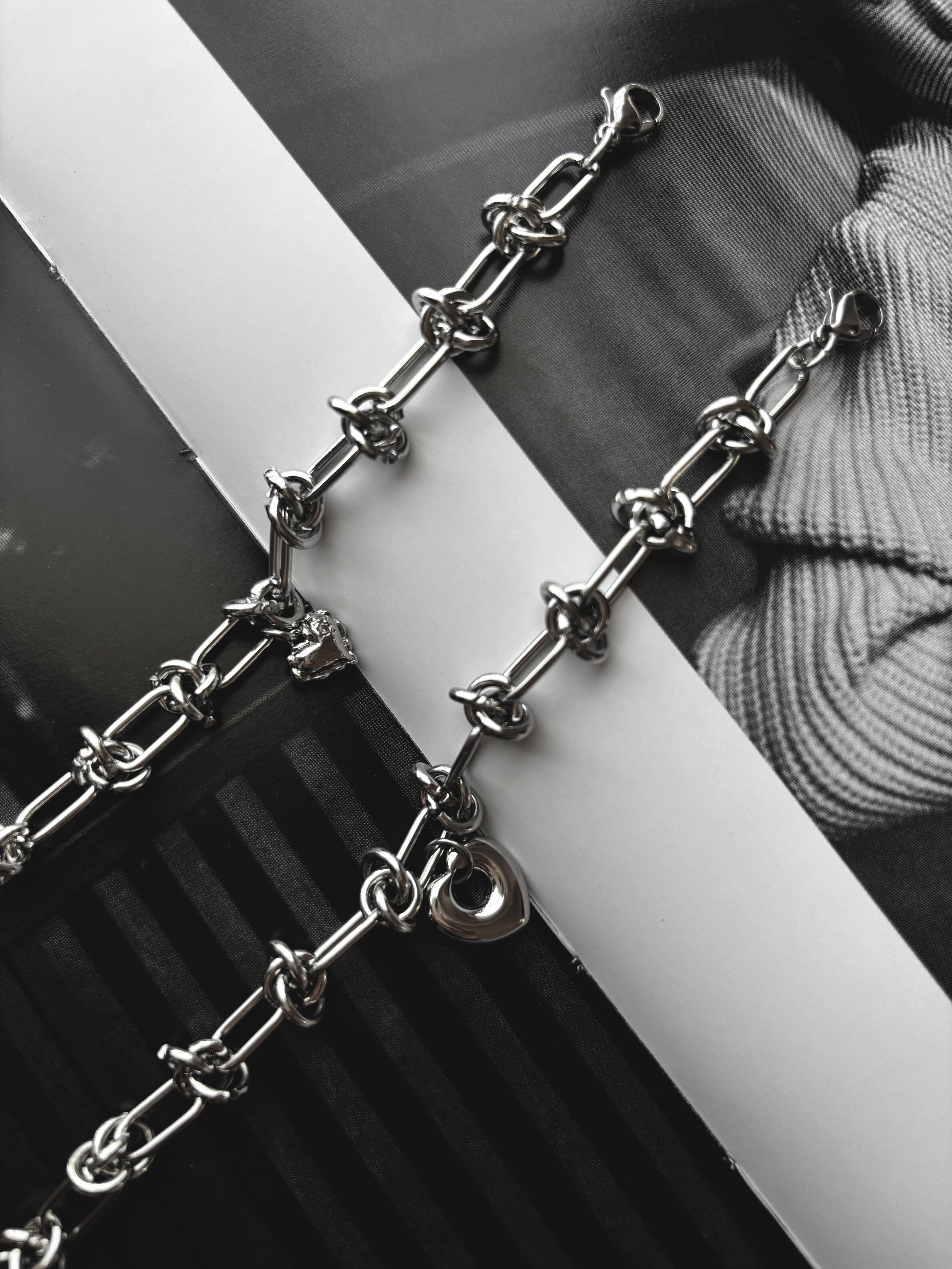 シンプルながらも心をくすぐるハートモチーフををチェーンのかっこよさとシルバーカラーの涼しさでクールに印象付けた大人のブレスレット。