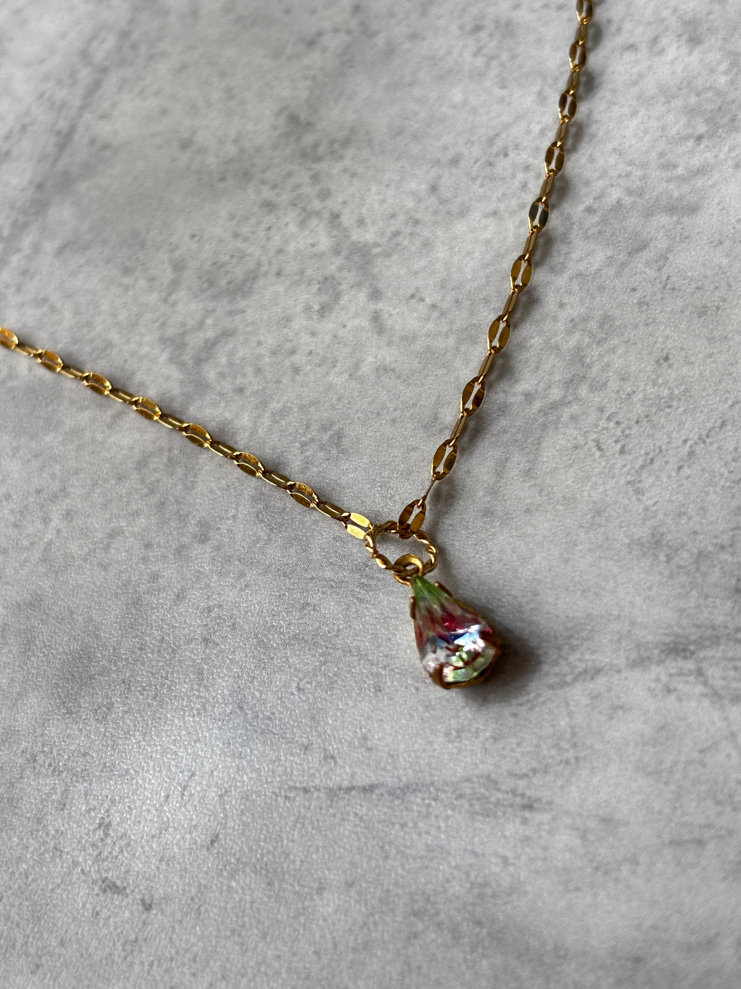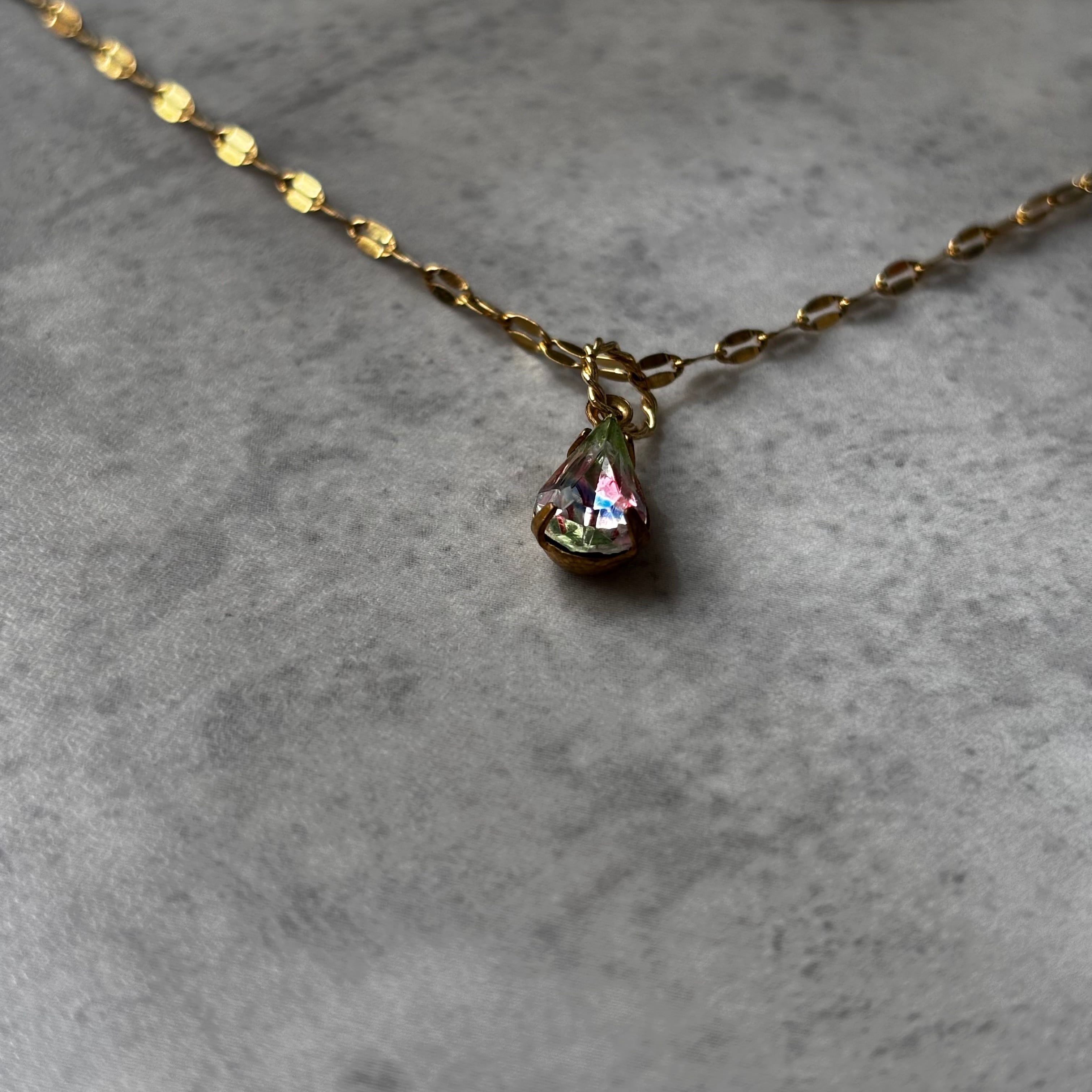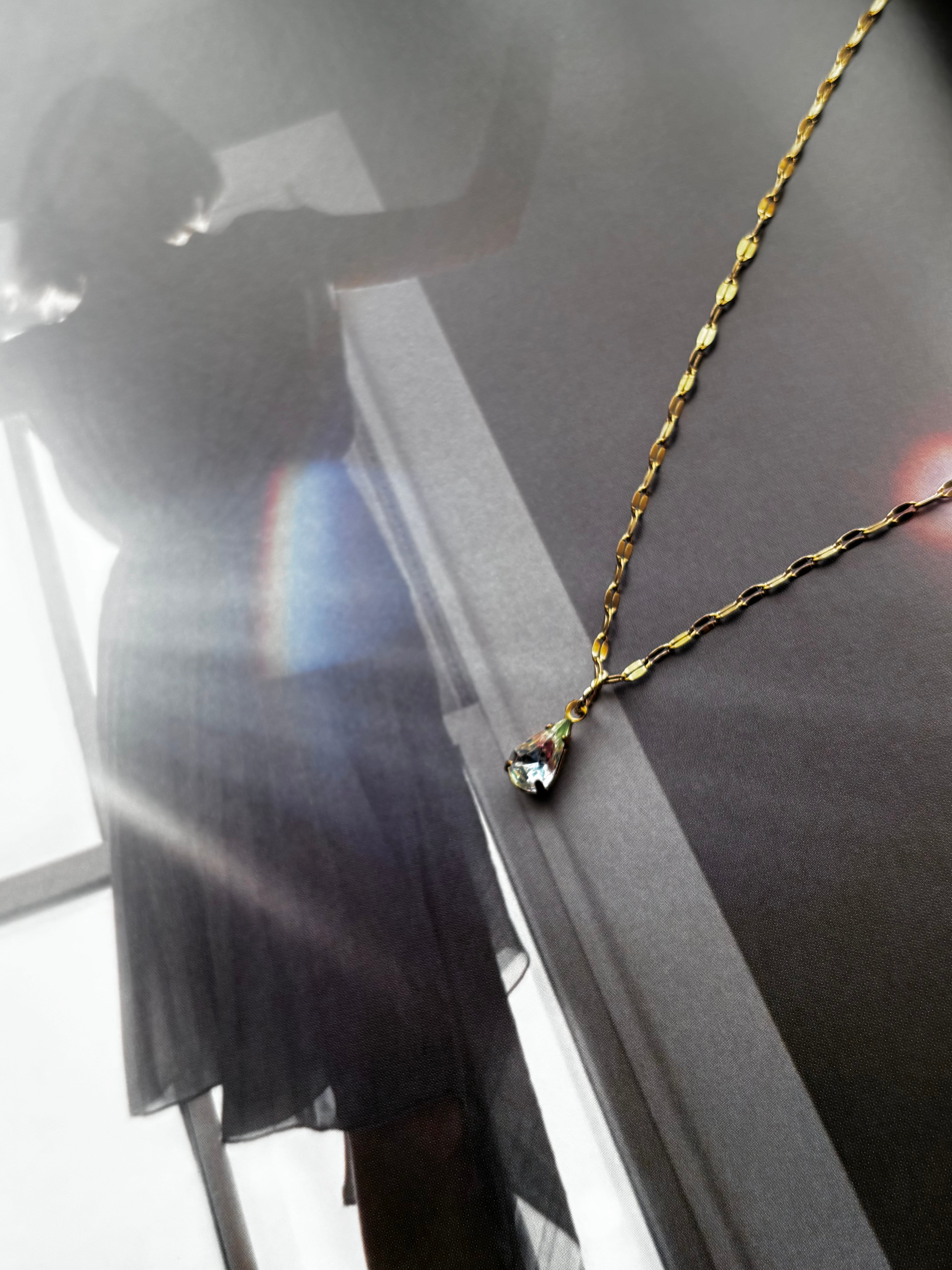 変色しにくく、金属アレルギーに強いステンレスのネックレスチェーンはキラキラと光を反射しアイリスガラスをより美しく引き立てます。