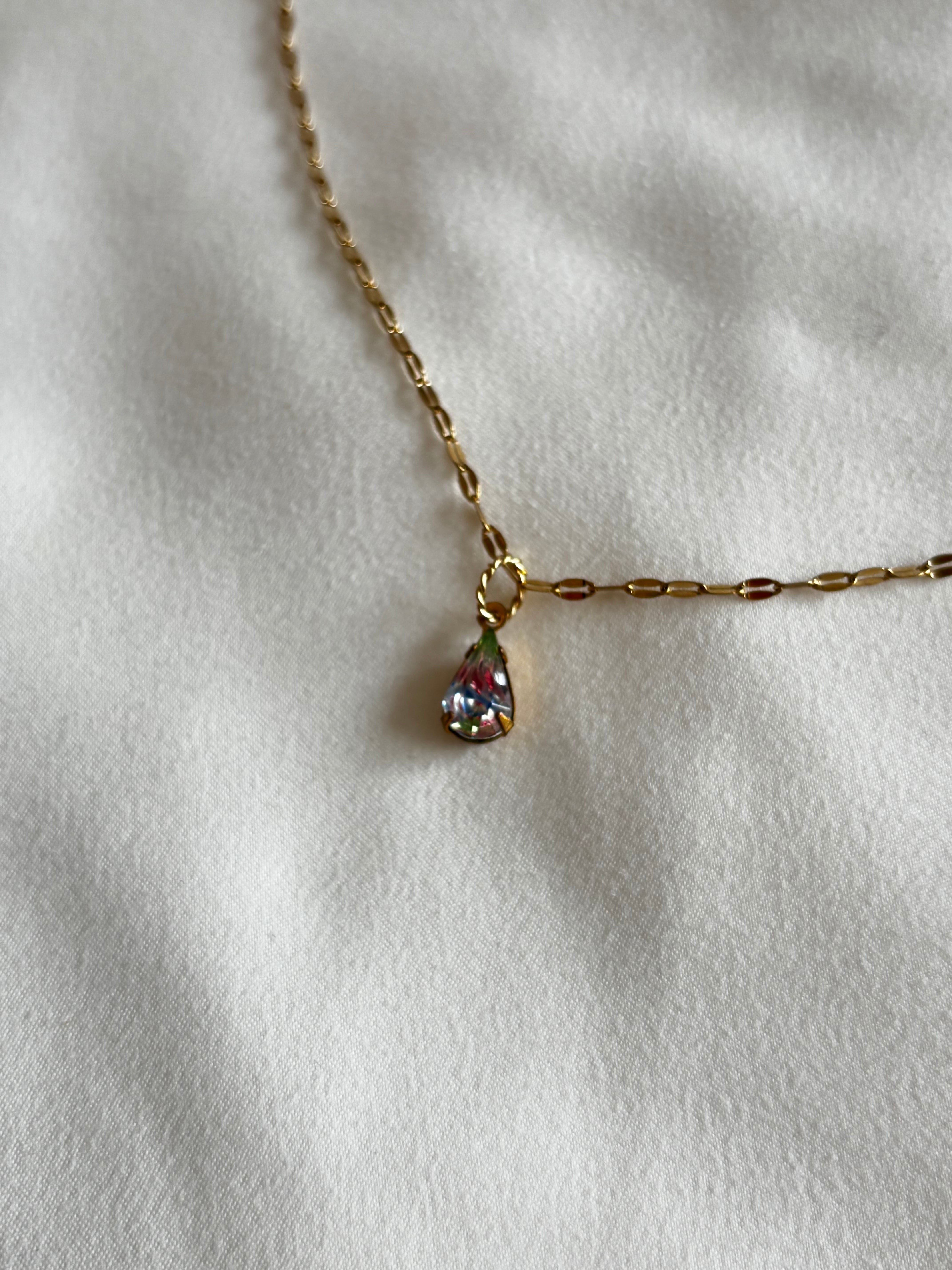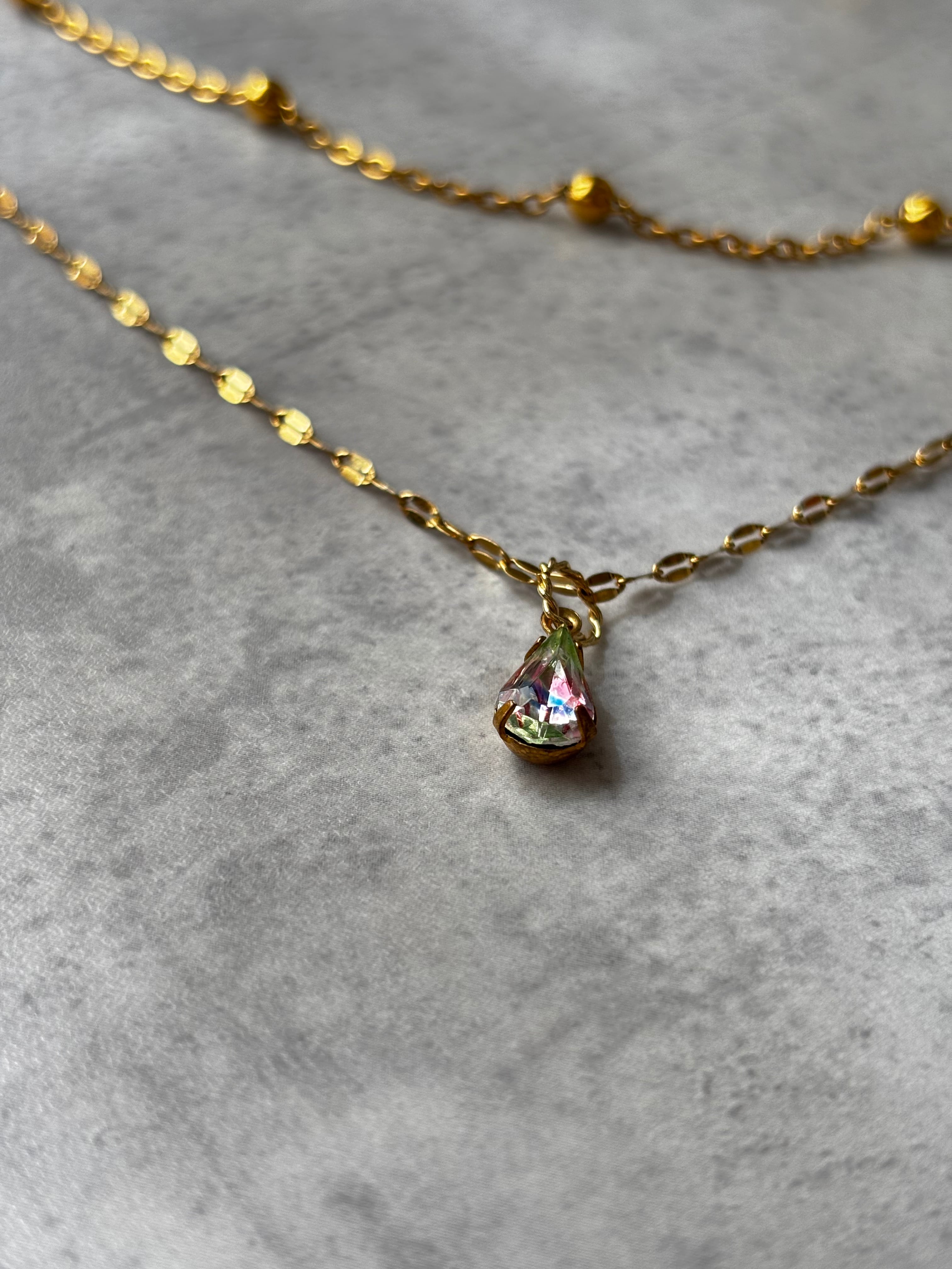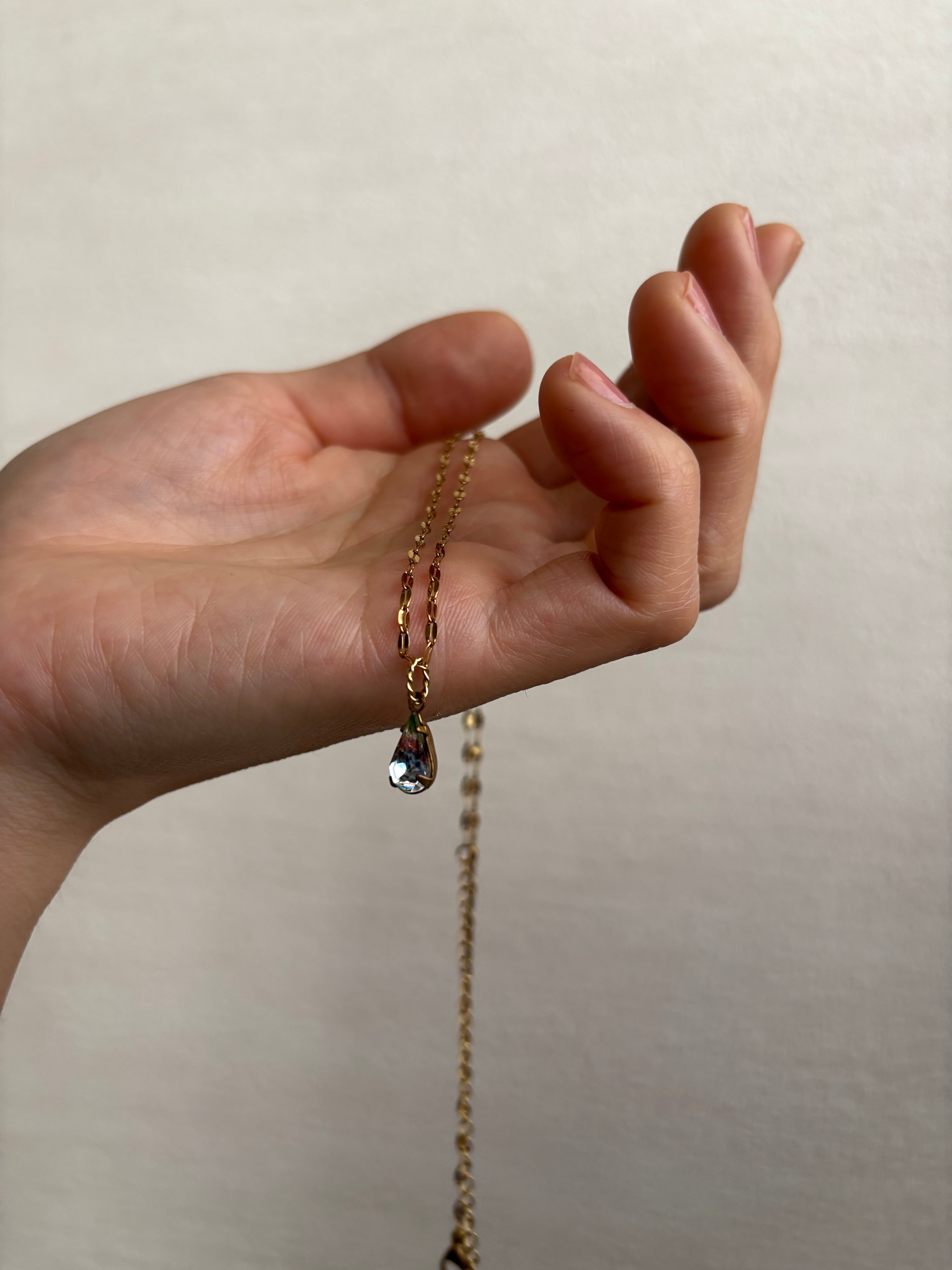 変色しにくく、金属アレルギーに強いステンレスのネックレスチェーンはキラキラと光を反射しアイリスガラスをより美しく引き立てます。